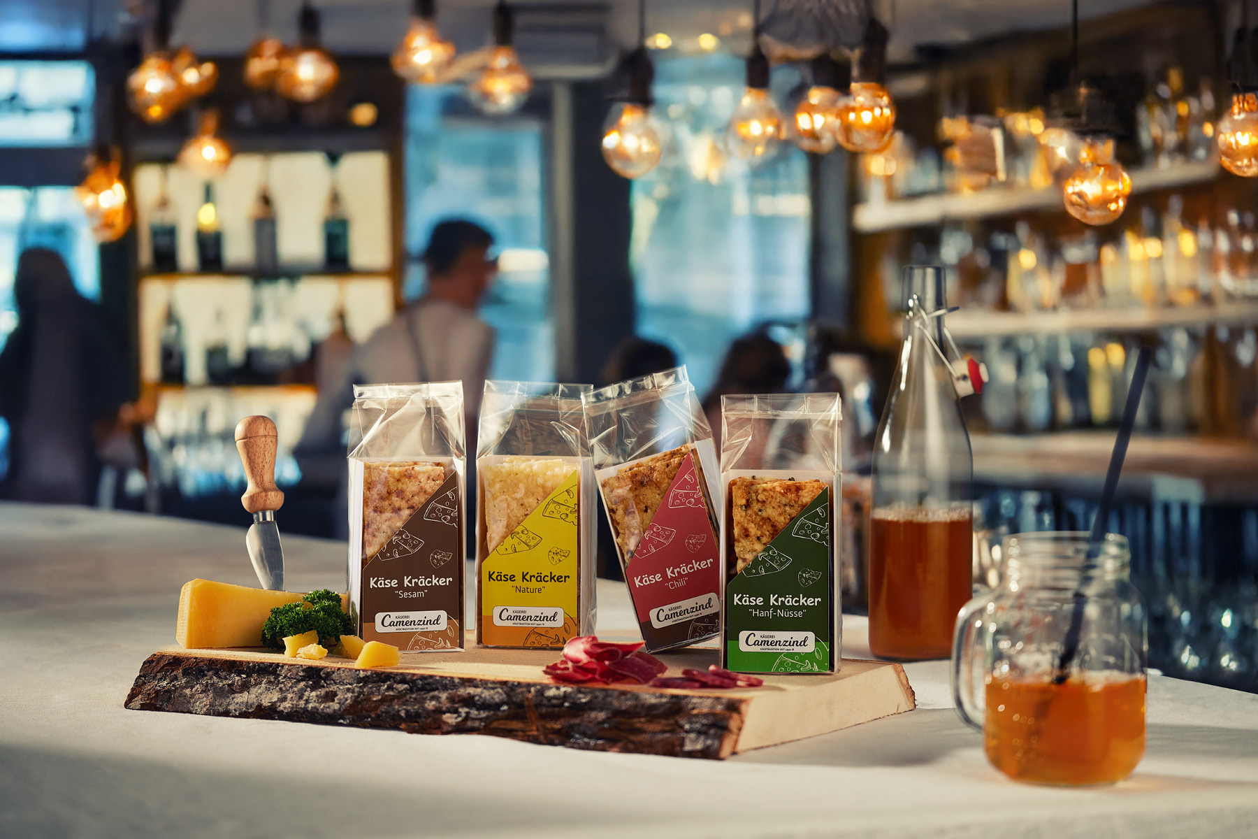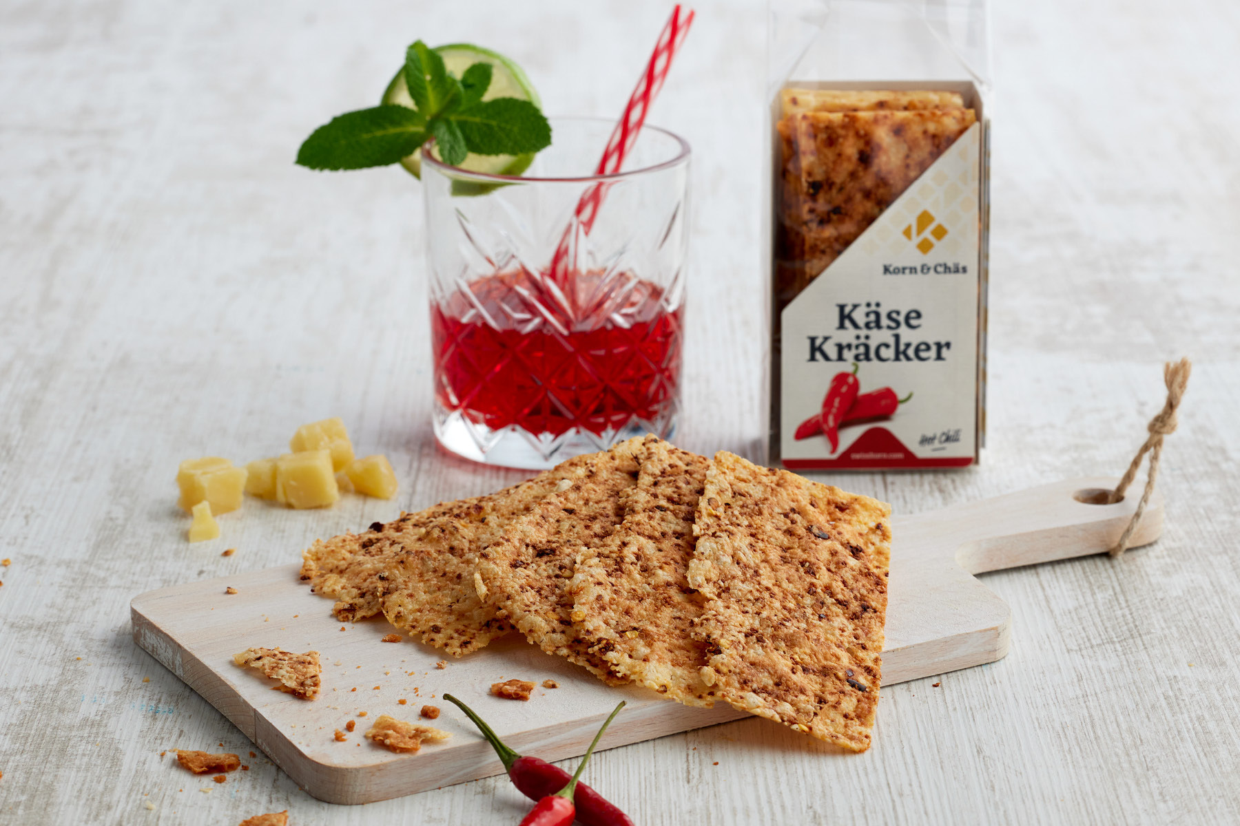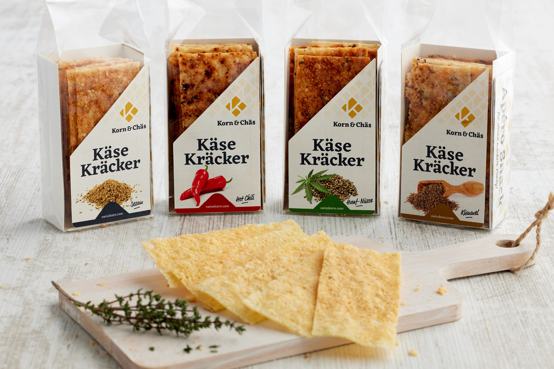 Die Käse-Kräcker in den Varianten Sesam, Chili, Kümmel und Hanf-Nüssen sind in der Schweiz einzigartig und erfreuen sich grosser Beliebtheit. Sie sind der perfekte Snack für zwischendurch oder ein Highlight bei einem Apéro. Hergestellt werden die Kräcker mit 100% Schweizer Käse. Für die Sbrinz AOP-Kräcker wird Käse aus der Bergkäserei Langentannen in Buochs verwendet, zu der Severin schon seit seiner Kindheit eine persönliche Verbindung hat.