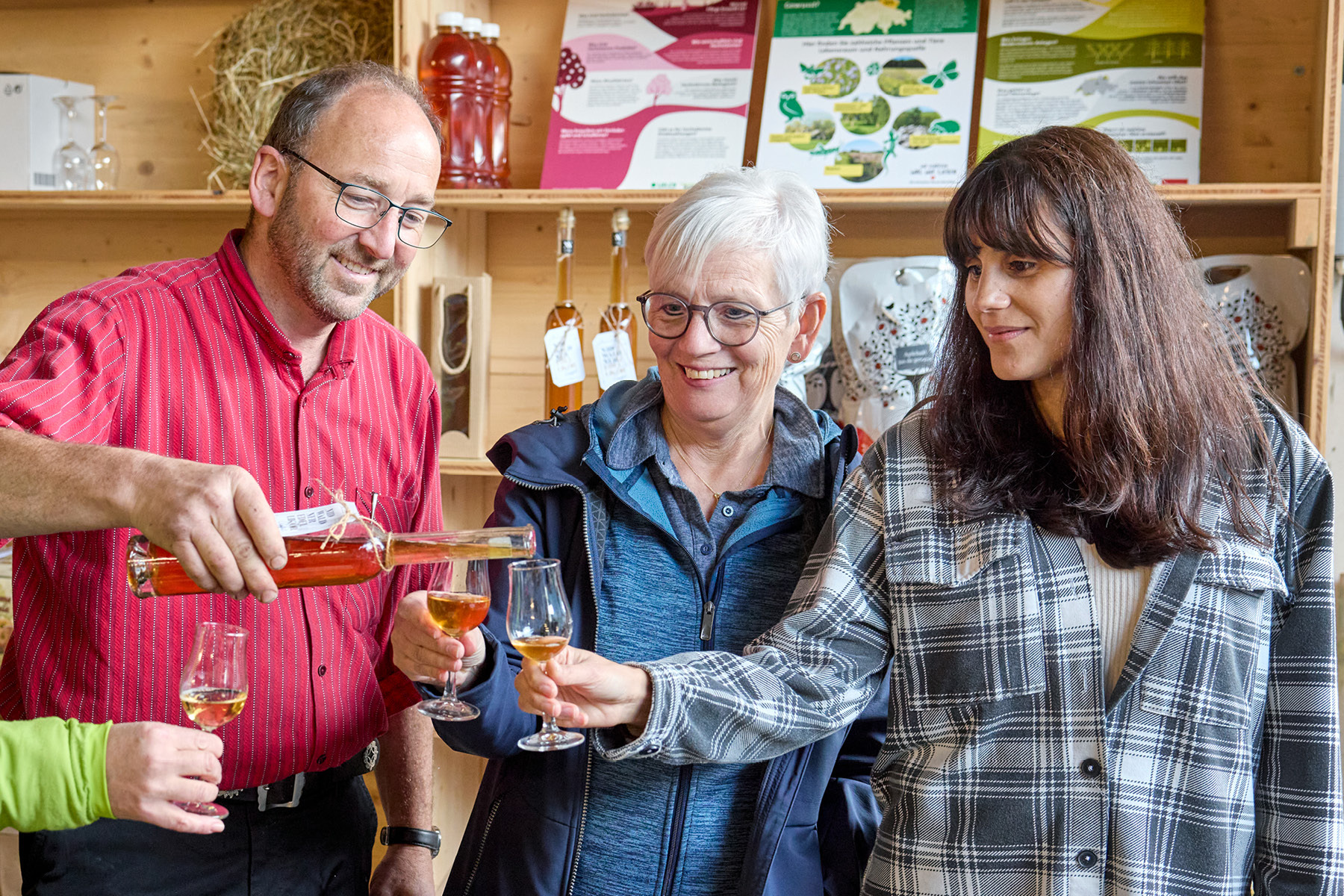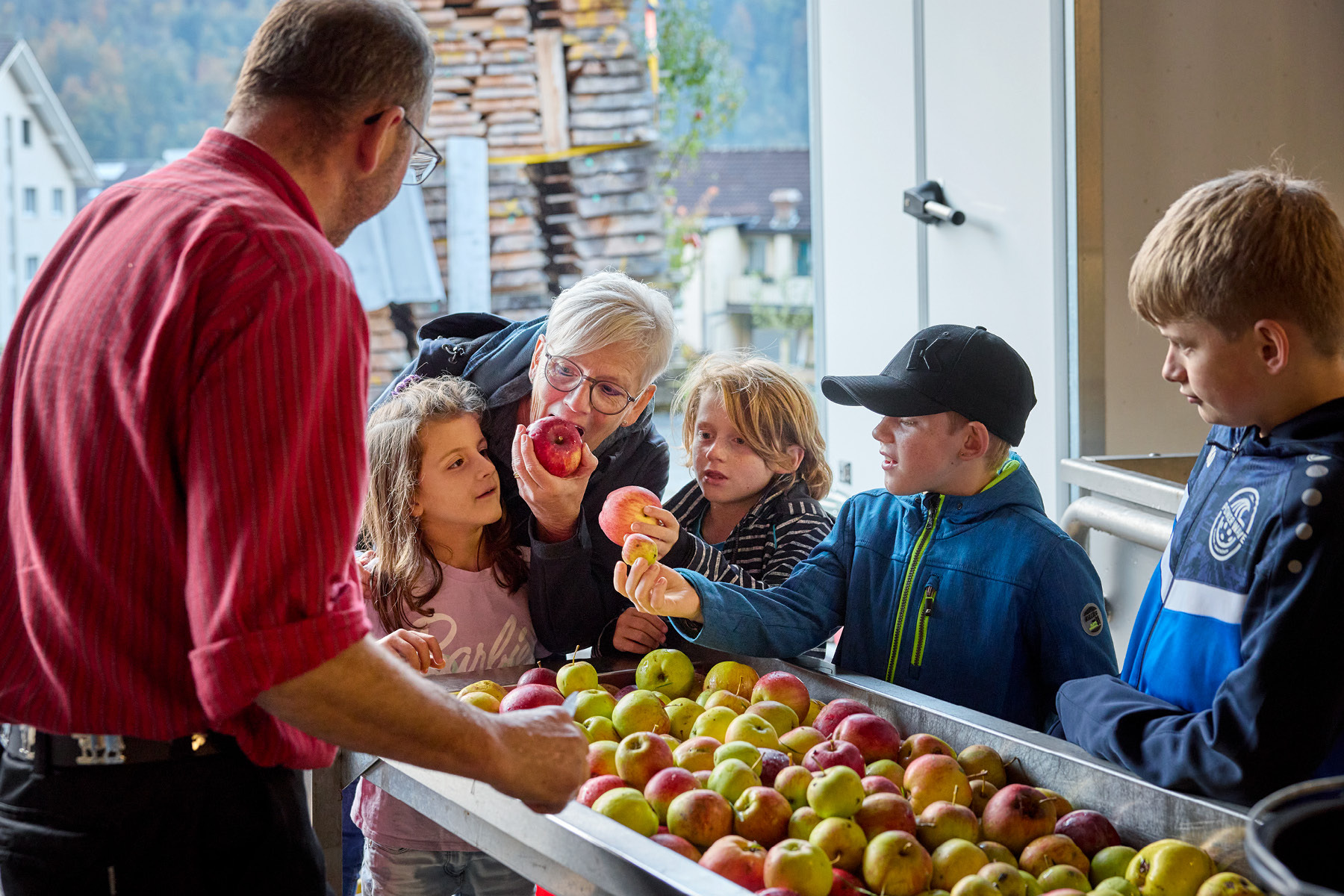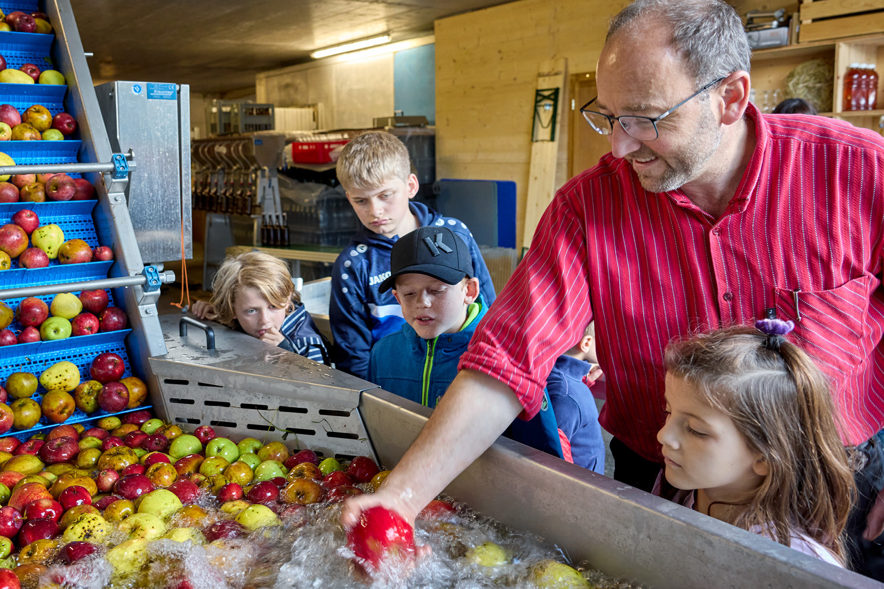 Hochstammbäume sind ein wichtiges Element für die Biodiversität. Sie bieten Lebensraum für viele Vögel, Schmetterlinge und unzählige Kleinlebewesen. Vor dem Pressen werden die Äpfel feinsäuberlich gewaschen und von Hand verlesen, damit ein qualitativ hochwertiger Most entsteht. Sämtliche Energie, die wir für die Produktion und Verarbeitung benötigen, produzieren wir in unseren drei Solaranlagen selber.