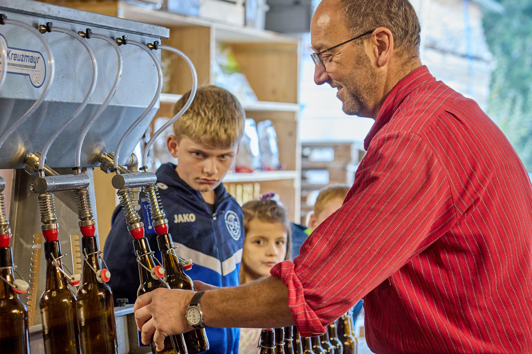 Das Hopfenschorle ist ein Erfrischungsgetränk mit sehr wenig Alkohol (1.5Vol.%). Es eignet sich hervorragend als Durscht Löscher für einen warmen Sommertag oder sonst in einer gemütlichen Runde. Die Basis ist Apfelsaft von traditionellen Hochstammbäumen, die nicht gespritzt werden. Der spezielle Hopfen, der bei uns auf dem Hof wächst, wir über längere Zeit im Saft eingelegt und mit Wasser für die Leichtigkeit angereichert. Was dem Getränk eine spezielle, erfrischenden Note verleiht. Der Gärprozess und die dazu verwendete Hefe sind ein Geheimrezept.