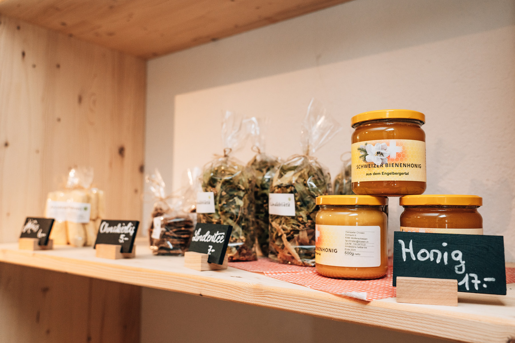 Der Hofladen wird sehr geschätzt von den Feriengästen und Jakobspilgern. Im Hofladen können die Gäste und Pilger nebst Produkten für die Wanderung, auch ein Andenken mit nach Hause nehmen. Zeit kurzem stehen zwei Kühlschränke im Hofladen. Darin befinden sich Fleischspezialitäten vom hofeigenen Weiderind und verschiedene Getränke aus der Region. Zudem gibt es im Gefrierfach die Stanser Glacé mit Vanille, Erdbeere, Zwetschgen und Kirschen zu kaufen.